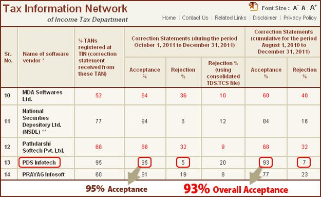 As per data provide by the Income Tax Dept., NSDL has recently published the “Software vendorwise percentage of correction TDS/TCS statements accepted and rejected at TIN” which proves TDSMAN (PDS Infotech) to be one of the most accurate & reliable eTDS Software with top acceptance percentage.